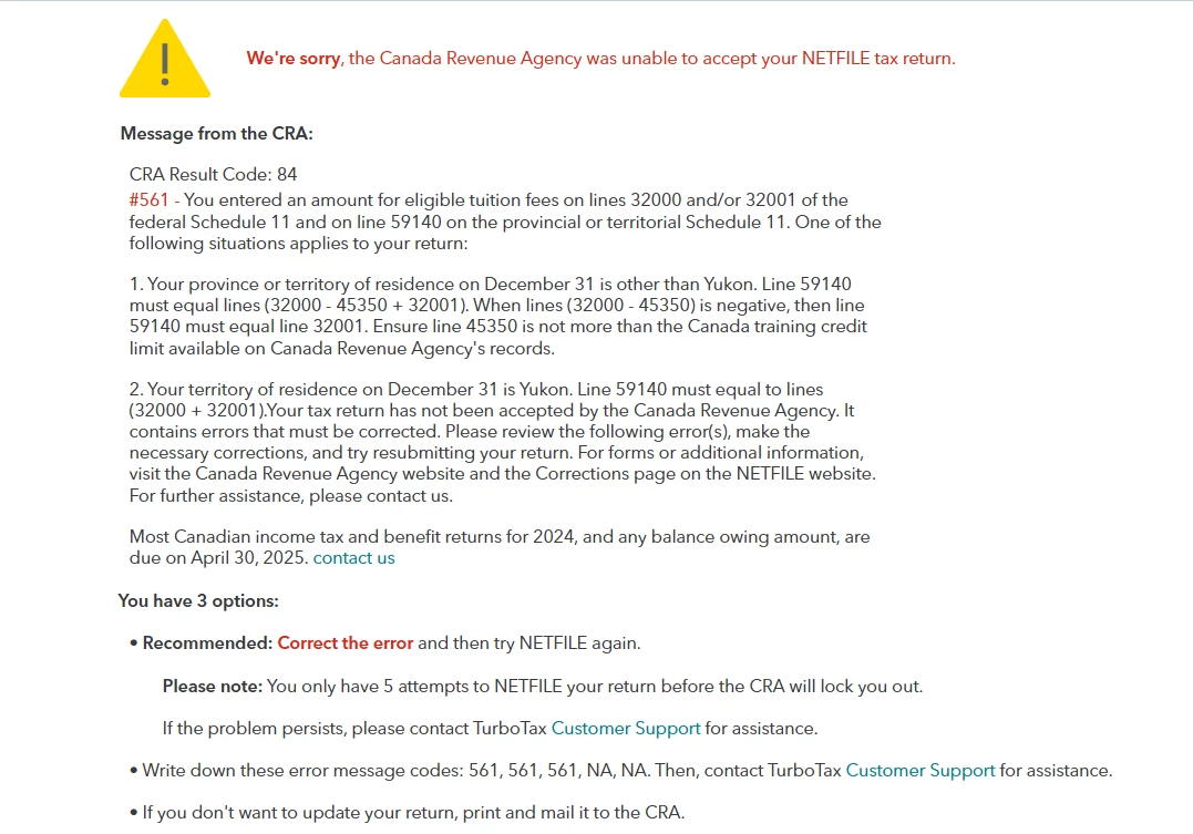 I also am experiencing this issue in 2025. I have double checked all my numbers and they are correct. There is no error in the numbers, but CRA says there is. It's not one of the common netfile errors being reported on the TurboTax blog. Now I find out this is an ongoing issue for three years with Turbotax? Brutal.