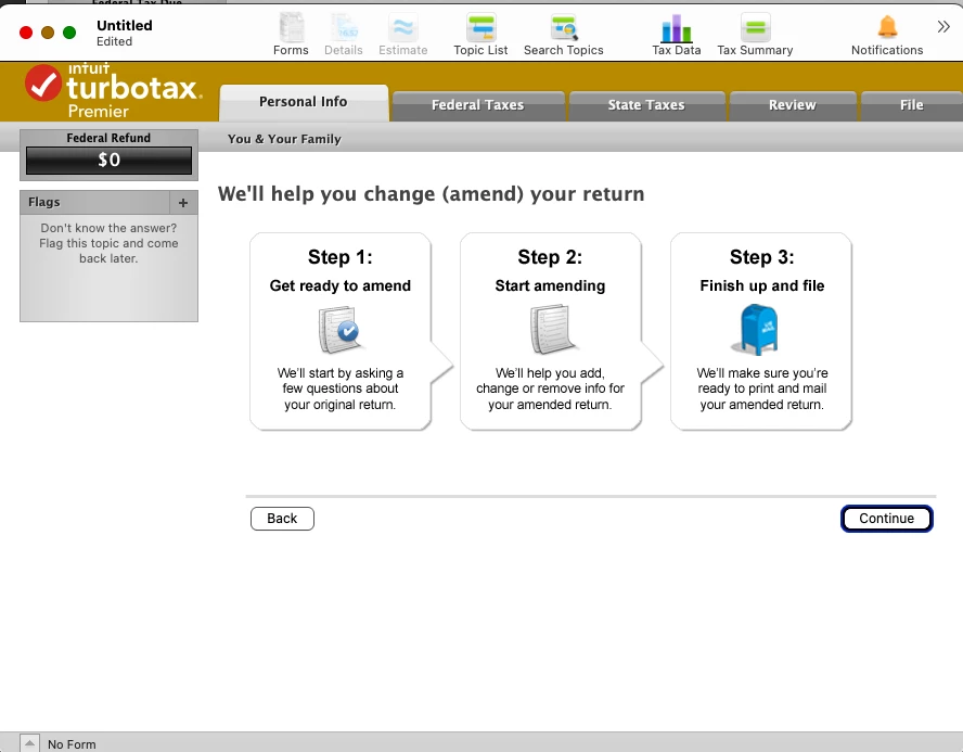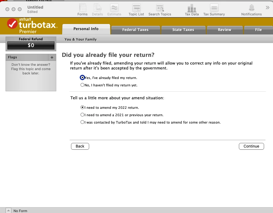 I don't know if I messed things up, but I copied my TT file into a new file called amended. I started making the changes, as recommended in the community, and saw I could be saving a lot of money. So then I tried to file this and obviously it failed. So I read up on how to amend. I started a new New Tax Return and selected "Amend a return...." I picked "Yes, I've already filed my return" and then "I need to amend my 2022 return", then I hit Continue. According to the TurboTax FAQ on how to Amend I should have been asked which return to Amend. It then jumps to a page asking which forms to Amend, there is no follow question about which file to Amend. So every Form is blank, so I can't really see how this can work. So...
