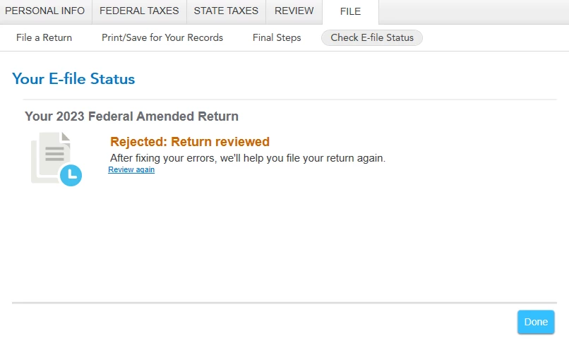 2023 Amended Return Rejected