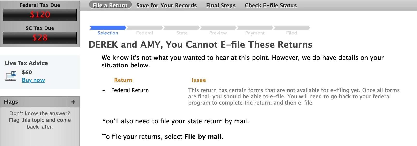 I forgot one minor source of income and have already e-filed. So I need to submit a 1040-x. I found the form on Turbotax and filled out the form, and everything looks correct. However, it is not letting me e-file this form. The notice says that the form is not yet available for e-filing. At the bottom it says I'll need to mail the form. Will Turbotax have the form ready soon for e-filing or will I not be able to e-file the form ans so should I just print the form and mail it in? Any suggestions?