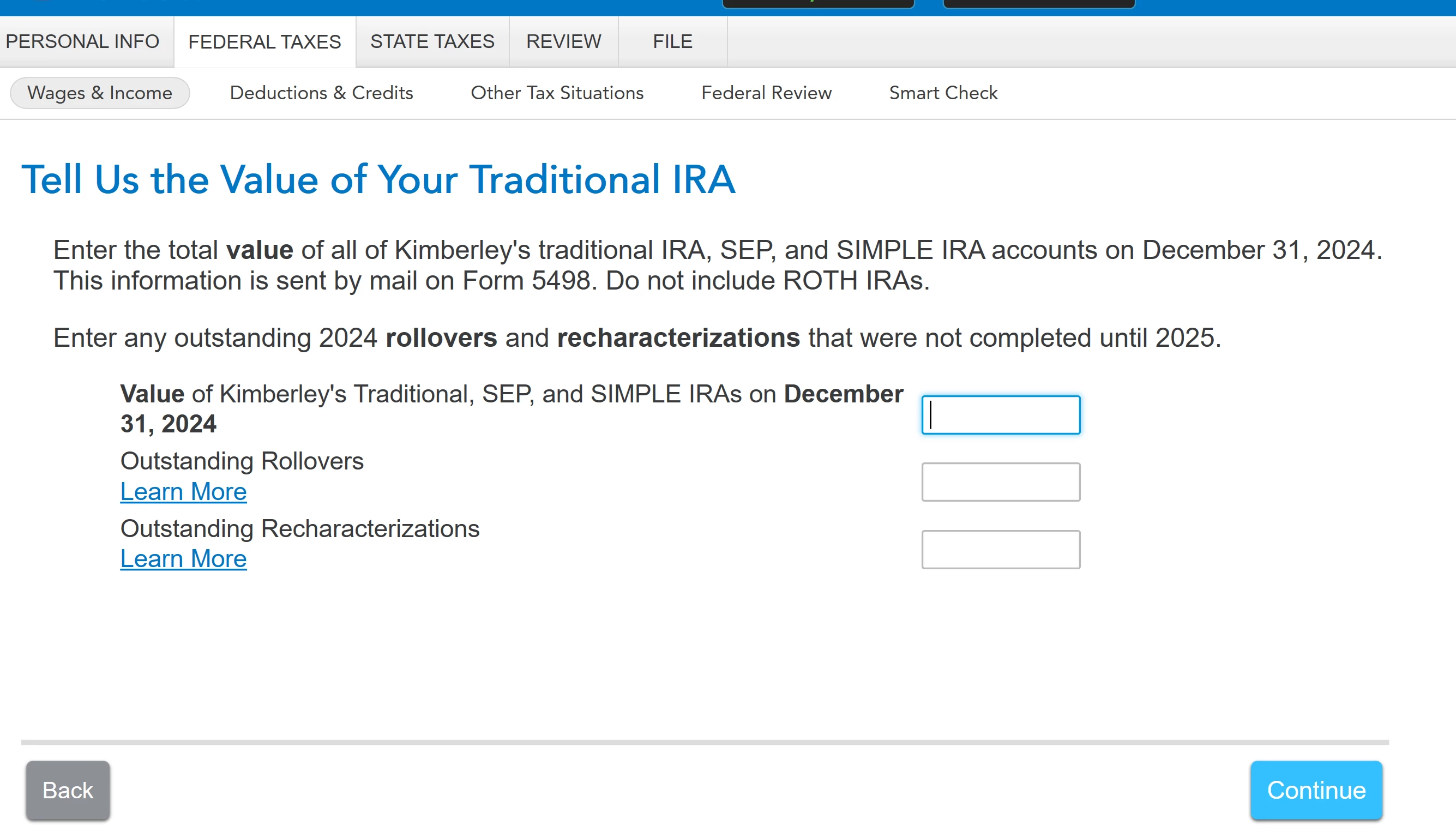 That said, shouldn't the value for the question, "Enter the total value of all of the IRA, SEP, and SIMPLE IRA accounts on December 31, 2024. This information is sent by mail on Form 5498. Do NOT include Roth IRAs..." be $0?