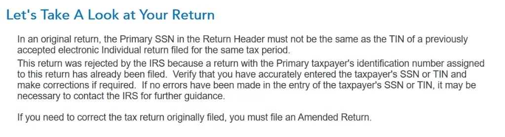 IND-452 - In an original return, the Primary SSN in the Return Header must not be the same as the TIN of a previously accepted electronic Individual return filed for the same tax period.