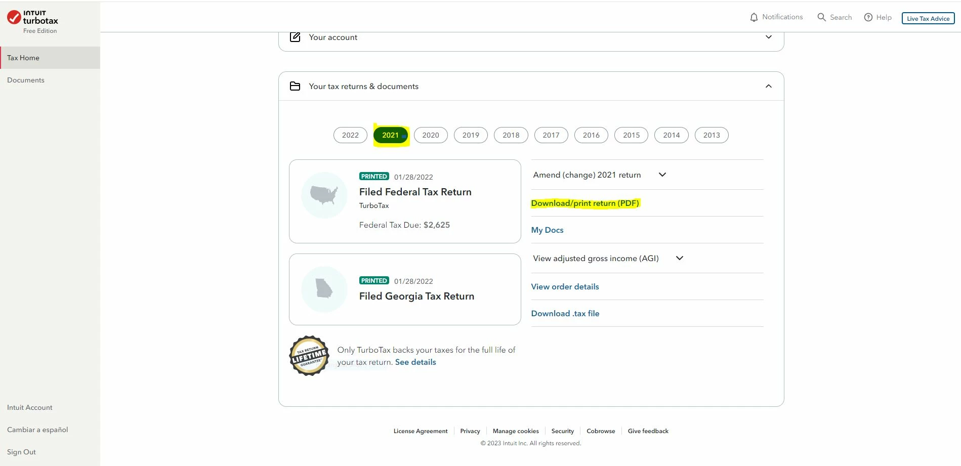 This process may take 10 to 12 screens before the link becomes available. Then click on Tax Home, scroll down to Your tax returns & documents