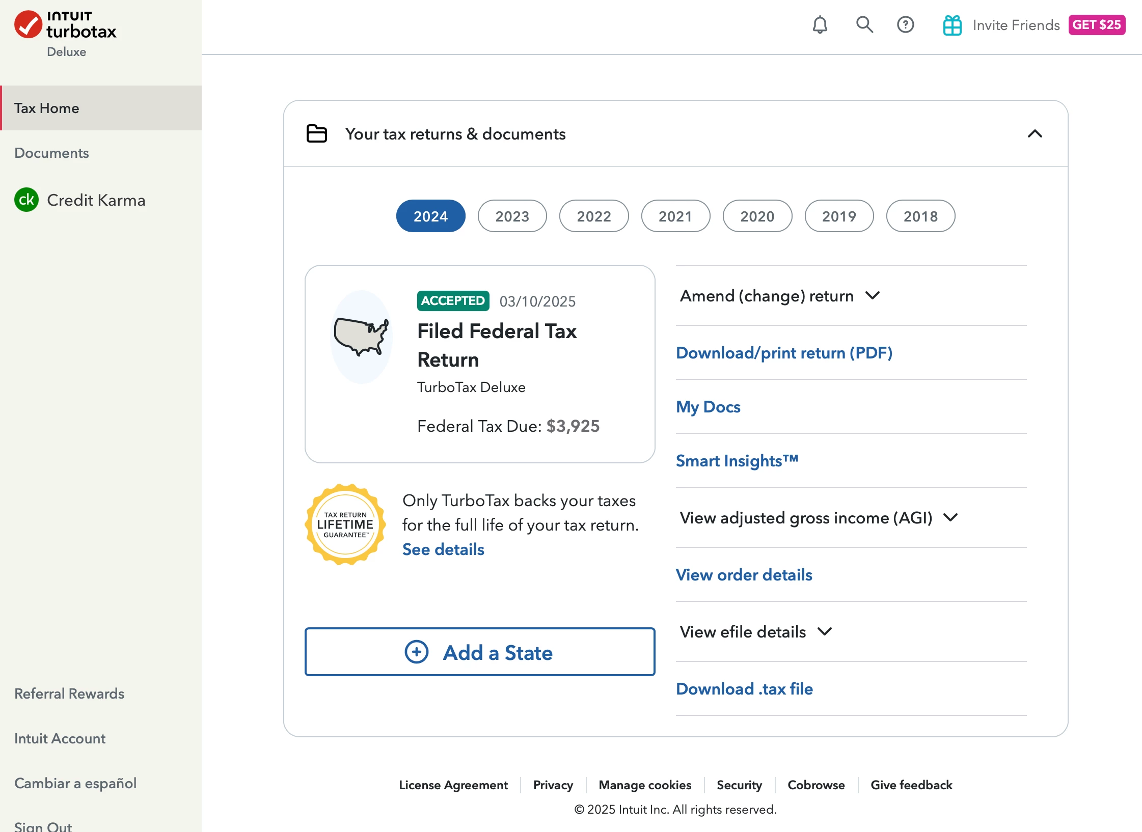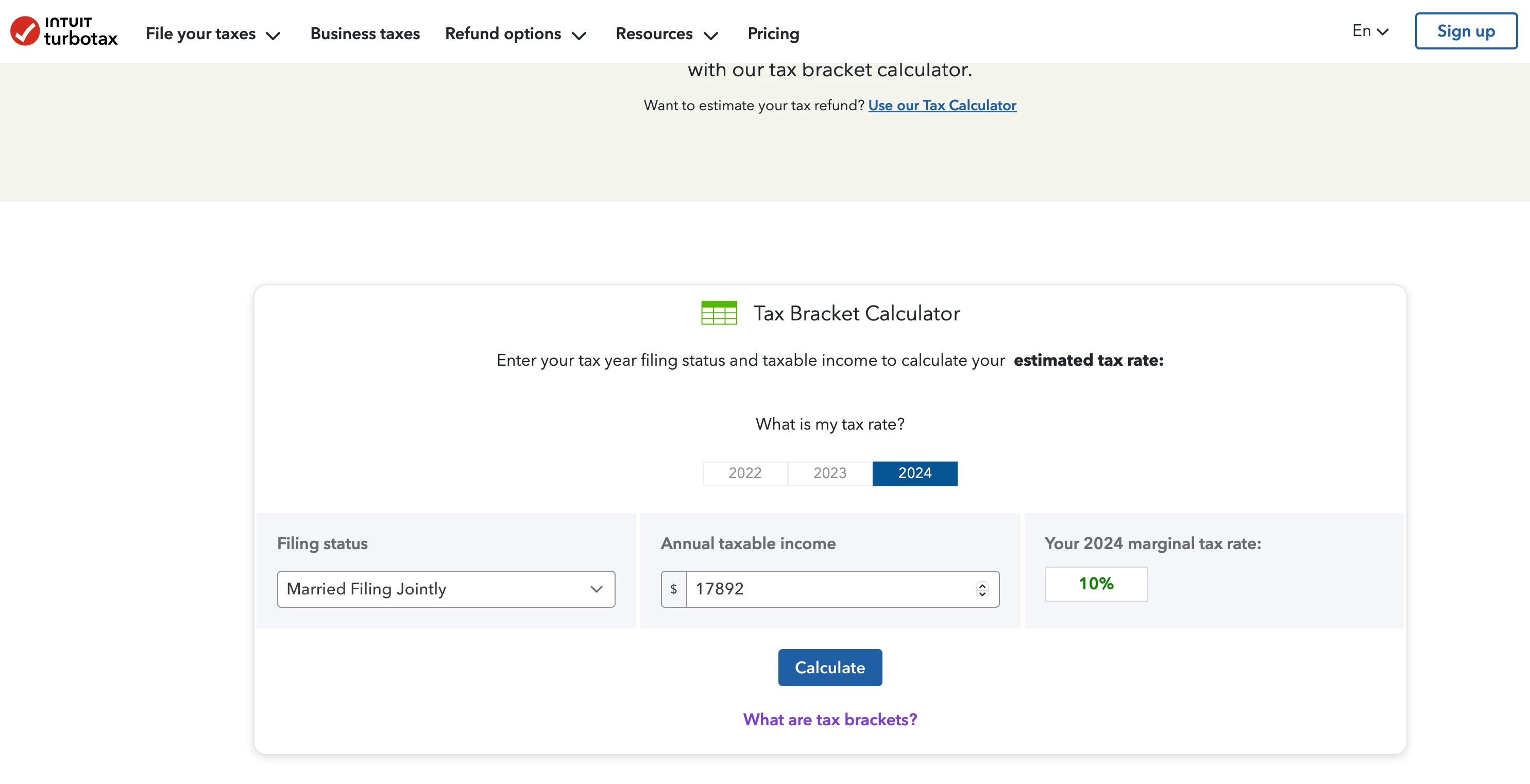 You were in the 10% tax bracket for 2024. This means that the next dollar of income beyond $17,892 gets taxed at 10% on your federal return. It's important to note that certain items, for example, long-term capital gains from the sale of stocks, are taxed at different rates than your tax bracket rate.