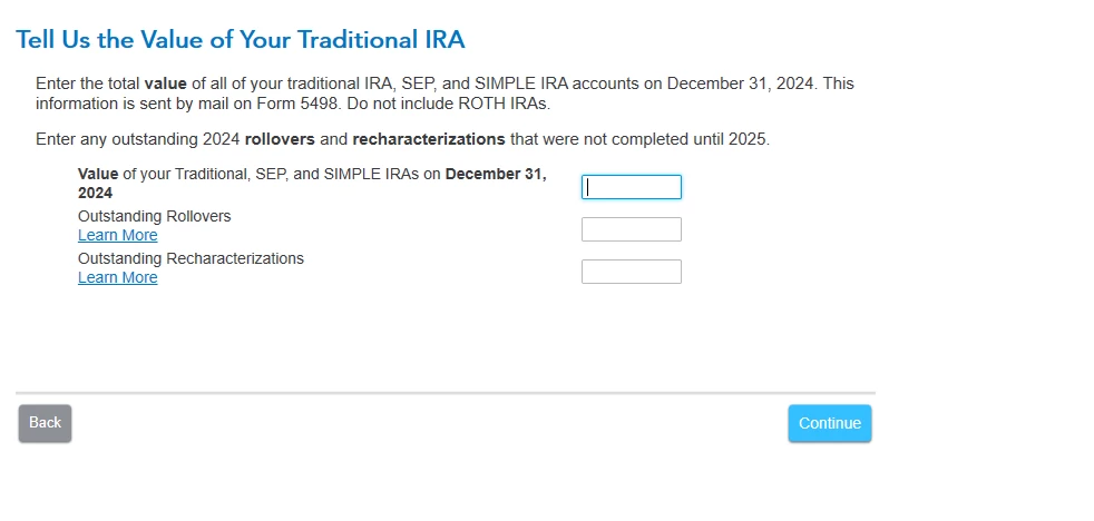 I'm not understanding the enter total value of all Traditional IRAs for Form 5498. I have one Traditional IRA in one financial institution that I intend to convert a certain amount a year to a new Roth IRA in the same financial institution. I'm going to try and attach a screenshot of the question that Turbotax presents me. I have several other Traditional IRAs in other financial institutions as well as two Inherited IRAs. Am I supposed to provide the full market value of the one Traditional IRA that I am using for the source of the conversion to the new Roth IRA or the total full market value of ALL Traditional IRAs and Inherited IRAs? I understand that the value is computed on 12/31/2024 but I can't understand the IRS instructions for Form 5498. I'm starting to think that this tax issue is too complicated for TurboTax. Any help will be appreciated!!