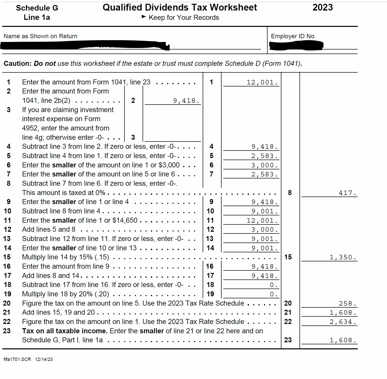One of your earlier posts, @Anonymous_ , in [December 17, 2023 1:15 PM ] addressing @Dave-estate, highlights that qualified dividends are taxed at capital gains rates. [I realize his was an estate, whereas mine is a trust, but I think there is no difference in respect of qualified dividends taxation.]