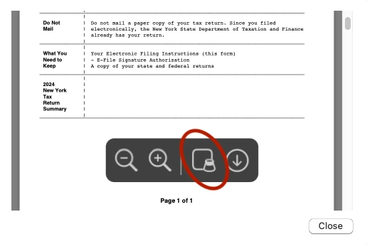 Once you click the icon, a locked pdf file will open. Just duplicate it or save it and the resulting pdf file will be unlocked. If your goal was to save the return, you're done. If your goal is to print, you can print.