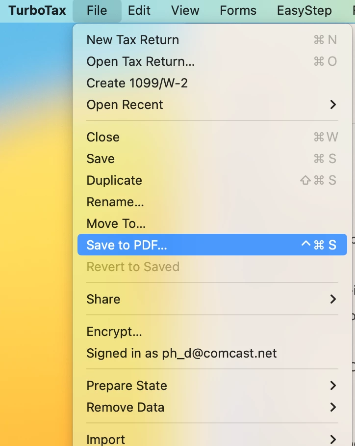 Just go to >File>SaveToPDF... in the TurboTax Menu on your Mac!