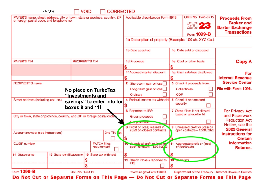 I received 1099-B's for "proceeds from broker and barter exchange transactions" that only have information in boxes 8 and 11; there's no other info for any other boxes. These 1099-Bs are for futures trading.