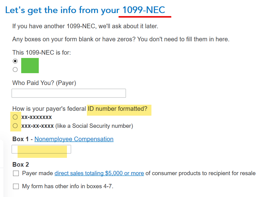 There are blank boxes on my 1099 nec, but turbo tax wants a number in the blank boxes.what do I do?