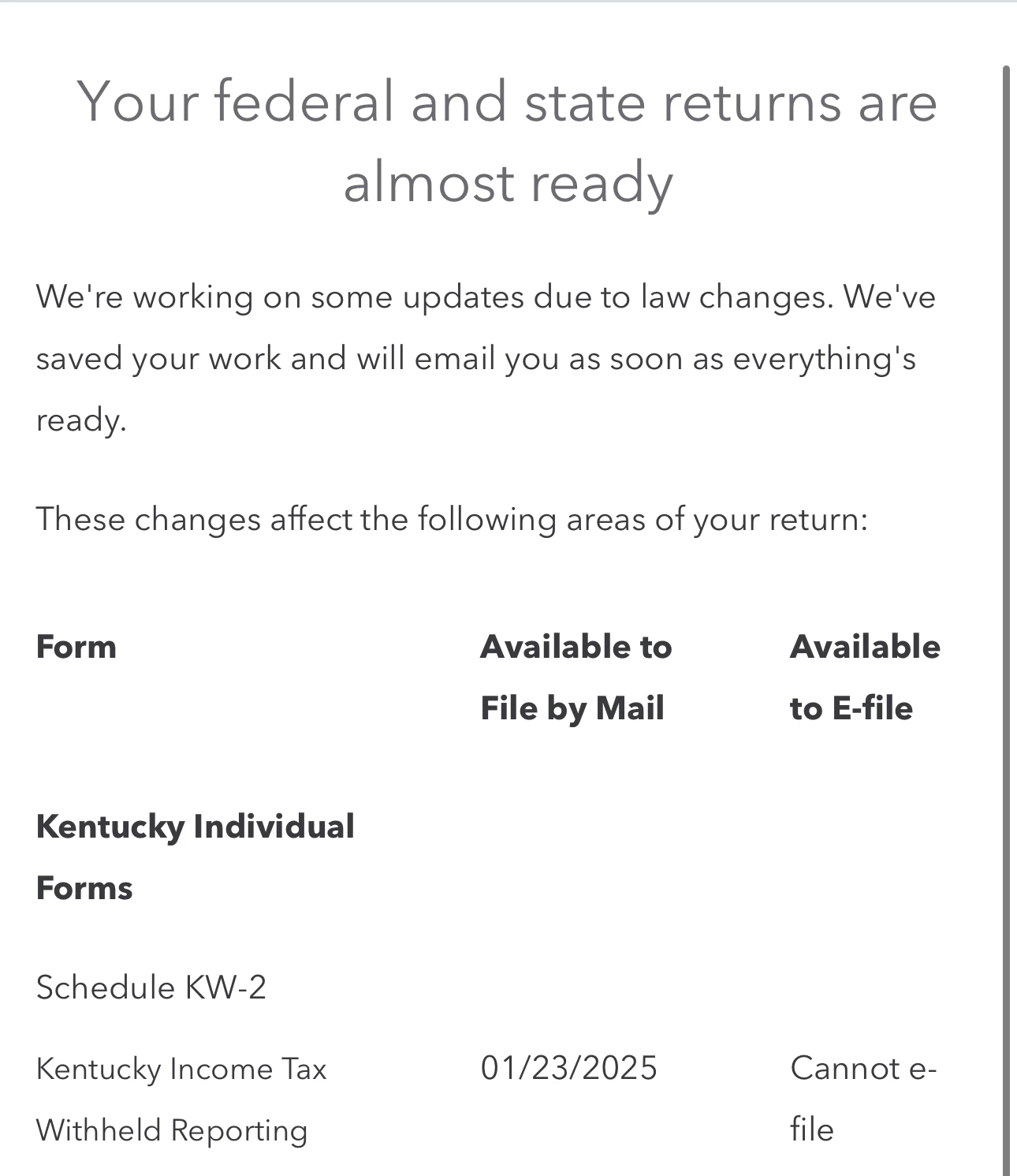 I’ve been using Turbo Tax for several years, have always efiled both federal and state. This year the below came up saying that the kw2 is not available for file? I’m confused, it’s my understanding the kw2 is only used for mail in returns, so why is it even saying it’s an issue?