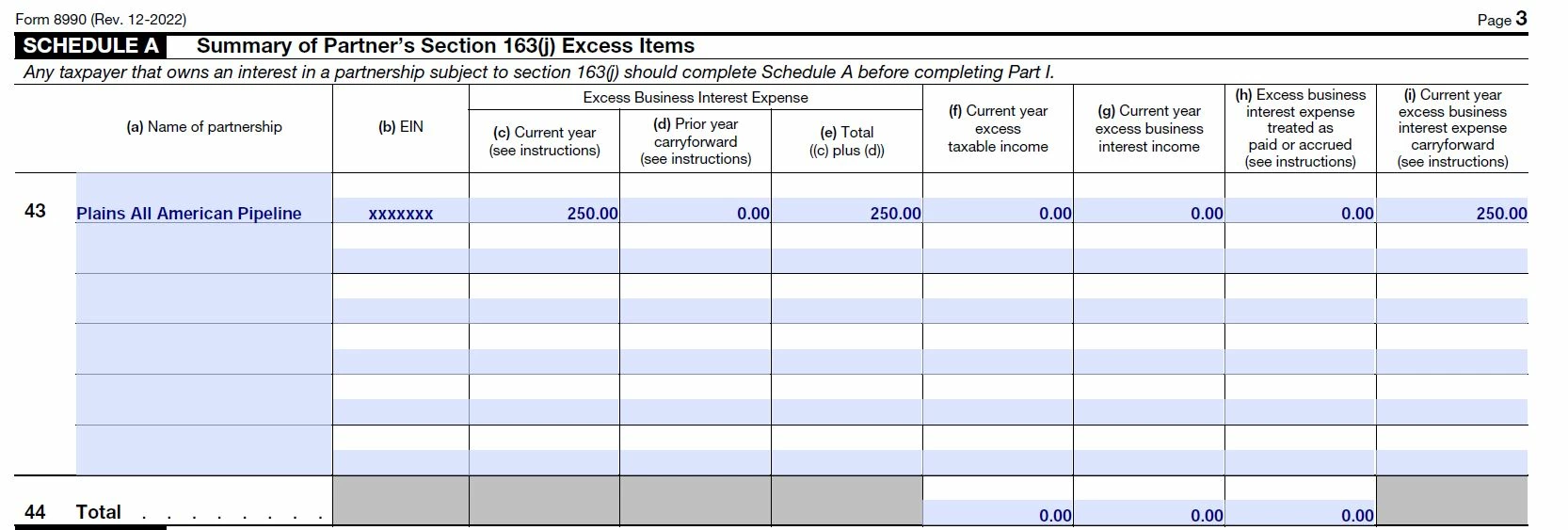 The Excess Business Interest Expense of $250 does not seem to appear anywhere except in Schedule A!!