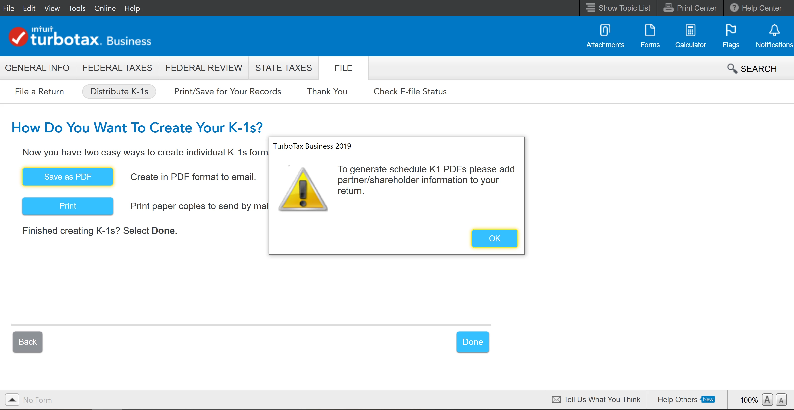 Using Turbo Tax Business 2019, click on Distribute K-1's and Turbo Tax responds with "Your Schedule K1 forms are not ready yet. Please add partner/shareholder information to your return". I have all beneficiaries listed, and it is an estate...