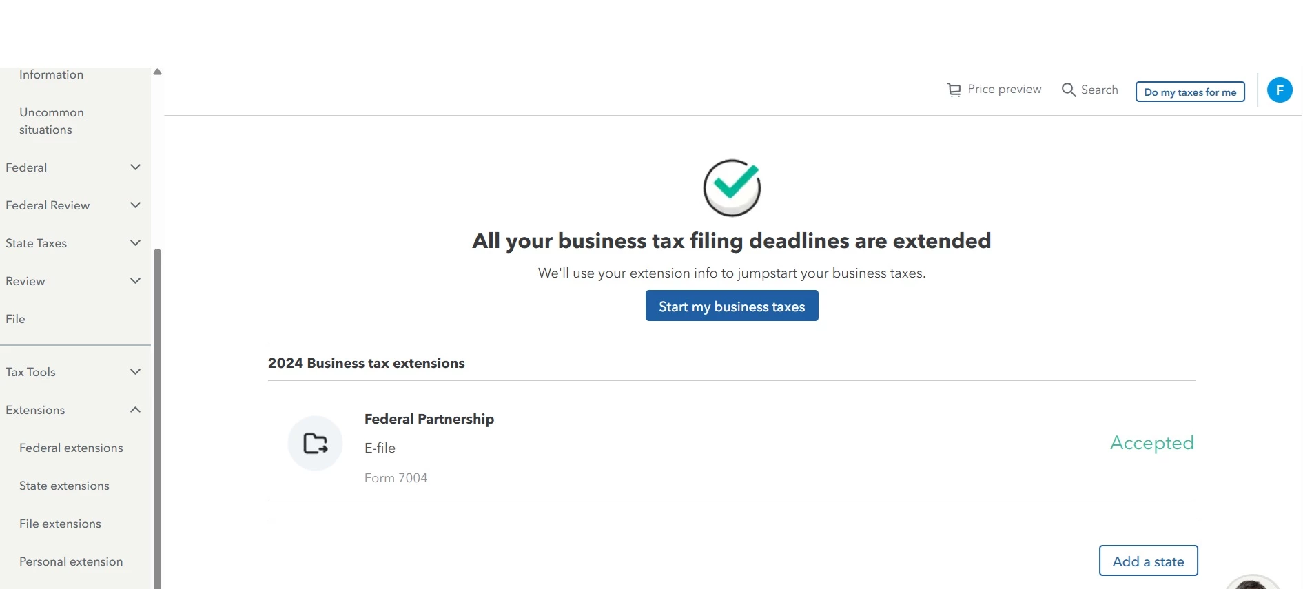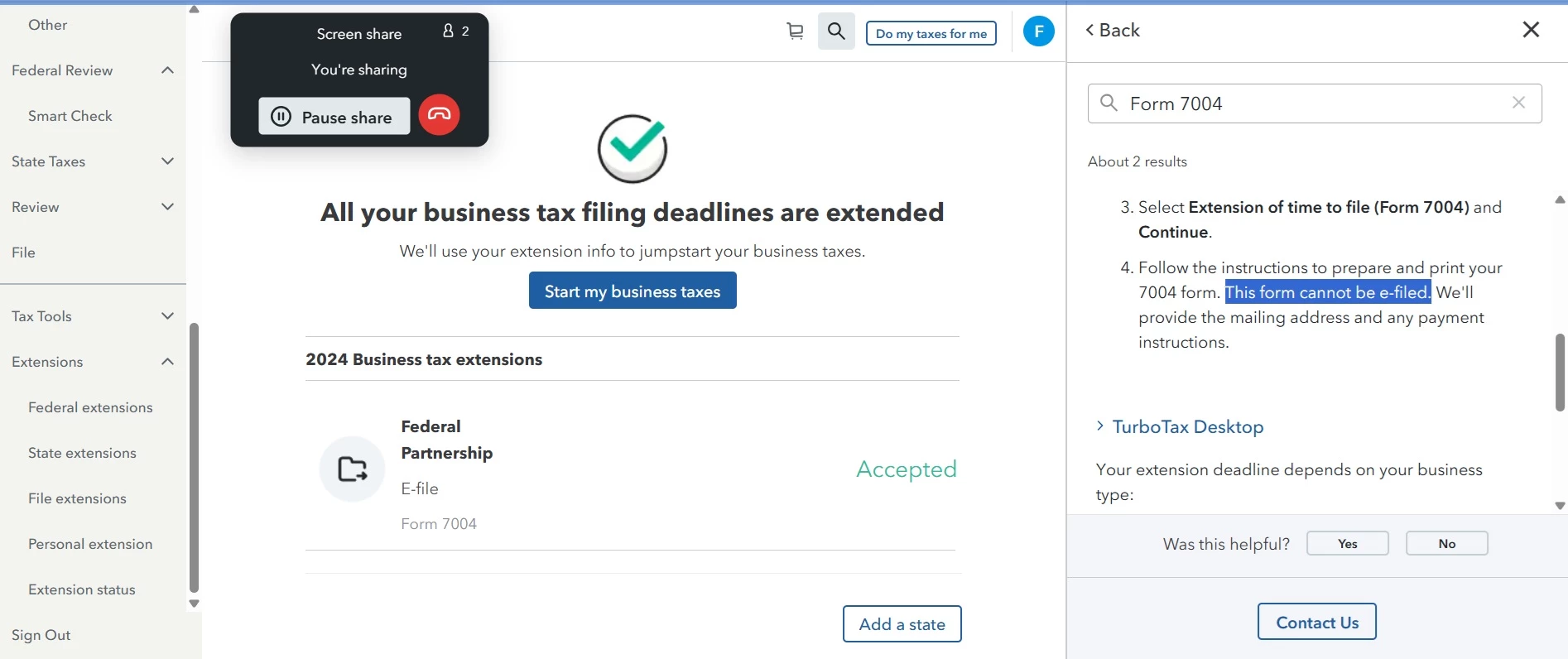 However, I noticed that TurboTax Business Live appears to allow me to do a e-filing. But when I search "Form 7004", the help page there actually explicit says no e-filing. Now I am confused. Is the e-filing real (it appears to be approved) or the information on help page just wrong? I took a screen shot below:
