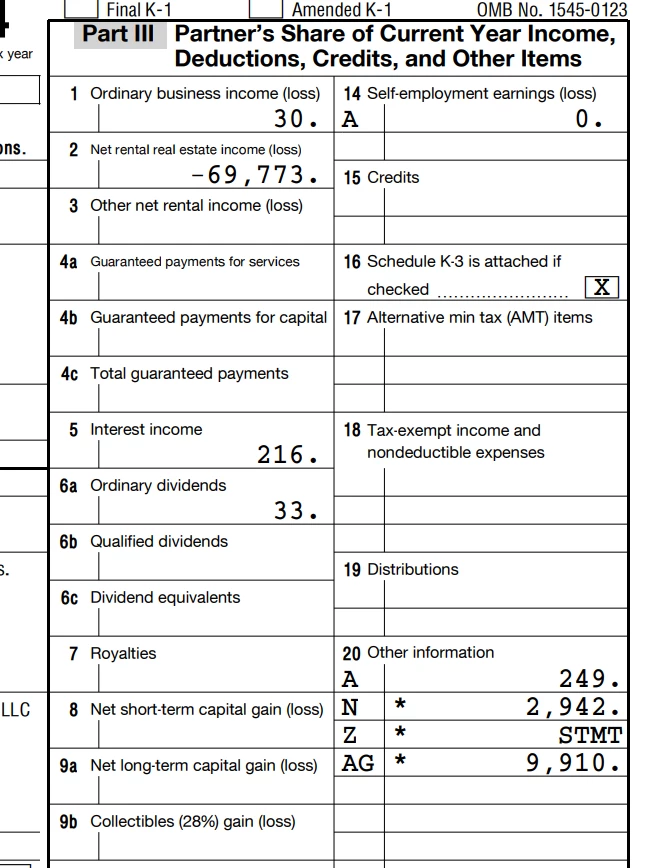 Form K1 - OBI and Real estate profits boxes checked and Code Z in box 20 has multiple passthroughs