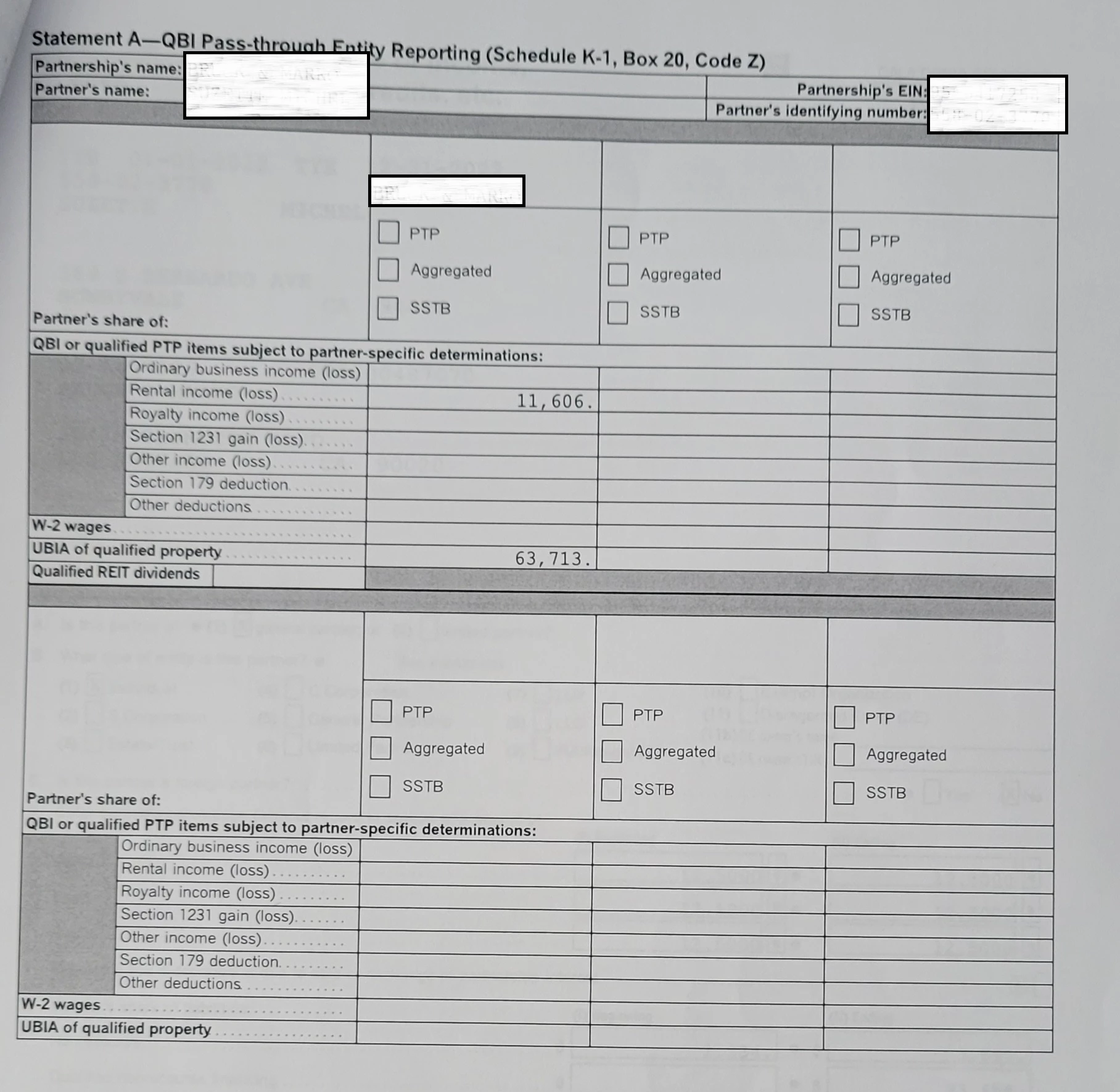 This is K1 Statement A for Box 20, code Z. I'm not sure what to enter in TurboTax - are the two amounts 11,606 and 63,713 relevant? Do I need to enter them somewhere? Or the relevant value is only "Qualified REIT dividends( which in this case is "0" I assume)?
