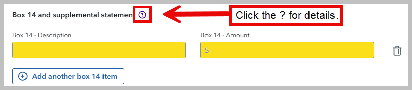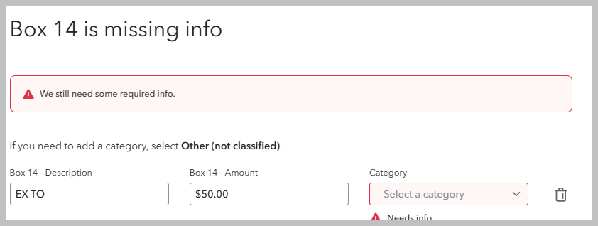 It depends. If you don't see a place to enter your box 14 category, it's okay. For now, just enter the description and amount from your W-2. We'll use this info to try to automatically report your category. If we can't, we'll follow up with you on another screen and ask you to enter it manually.