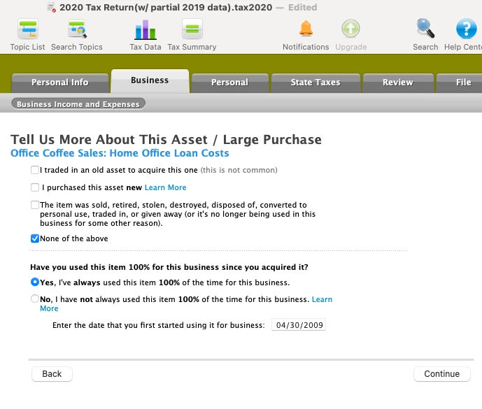 How do you enter the asset EQUIPMENT information (Description, Date in Service, Cost, Basis, Method, Prior & Current deprec.) for prior year -and- current year EQUIPMENT in TurboTax Home & Business 2020 DESKTOP on a MAC? Yes, it is late 2023 and I am just now filing for the 2020 tax year. I’ll be doing 2021 & 2022 w/ TurboTax as soon as I figure out this depreciation issue in TT 2020. I have overpaid all my prior year pre-payments, but did not file... until now. In two + days of Googling this, I have found no answers for "equipment" depreciation. I'm very frustrated, so I searched for a TT forum, and here I am. ;o)
