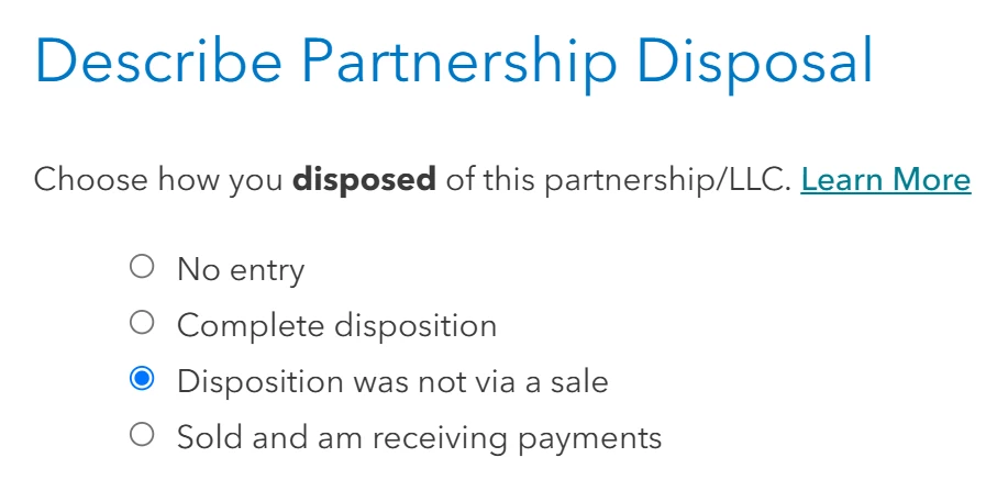 The partnership ended in 2024. It was a Complete disposition and the Disposition was not via a sale. Which of the 2 choices in TT is the correct one?