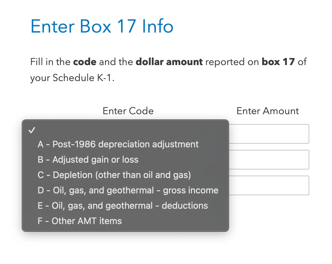 k-1 box 17 drop down menu