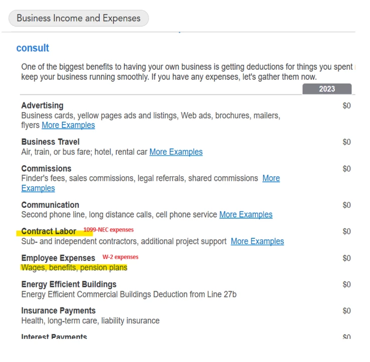 Wages you pay to employees are deductible on your business return. If you file Schedule C, those expenses are entered in Common Business Expenses.