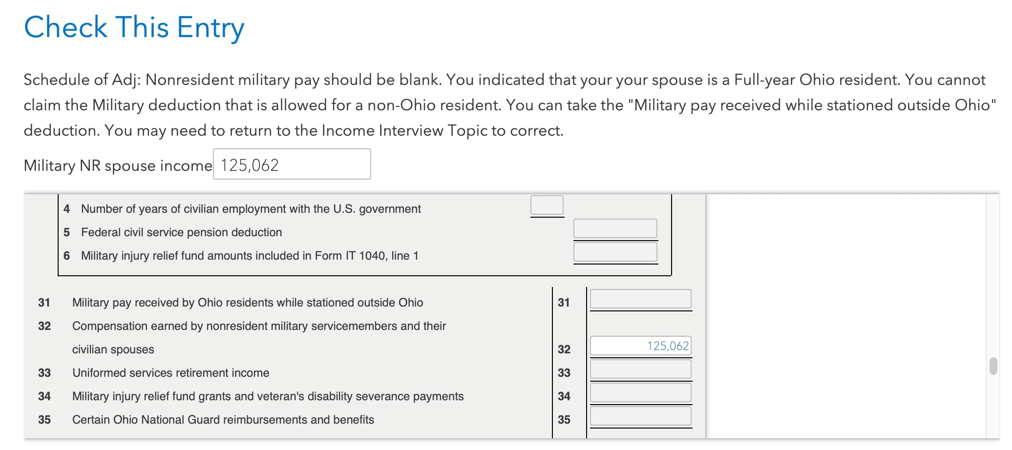 Where can I find the correct place to enter in Ohio income earned while stationed in another state? The only option I can find in this program is Non-residents stationed in Ohio. If I put the number in there it shows on line 32 of the Schedule A. I need it on line 31 instead. Please help!