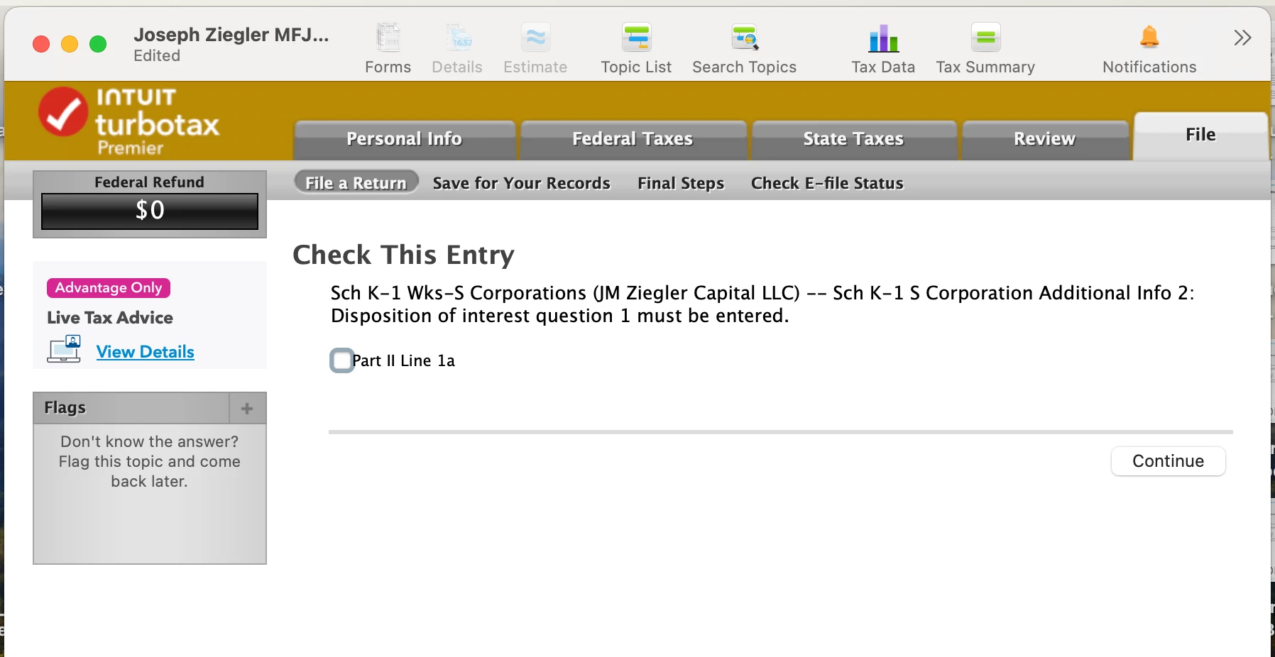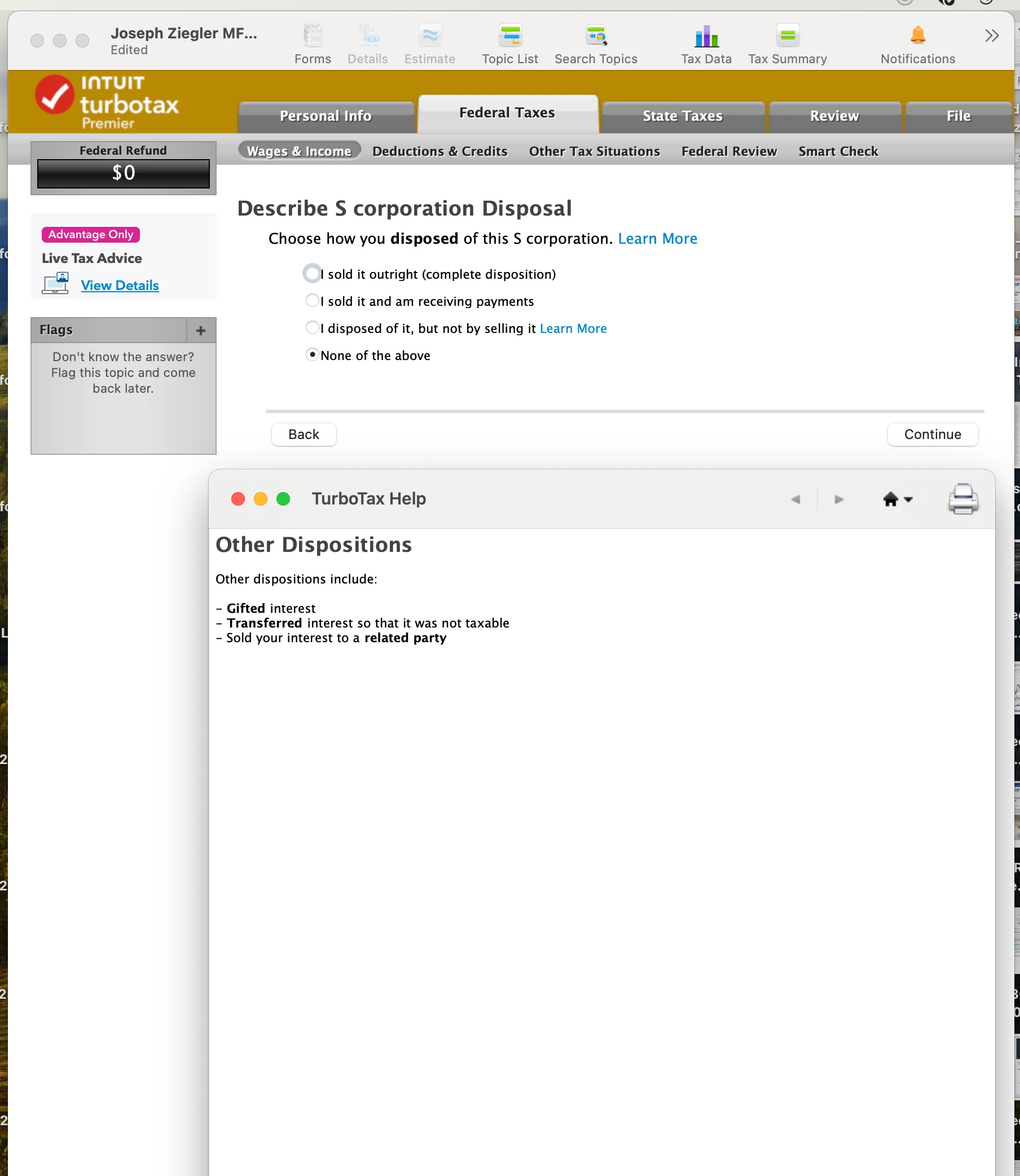 Closed this LLC with S-Corp election ending 2023. In final review, TT will not let me skip Part II Disposition of S Corporation Shares section. I had no shares in the LLC, was only managing member. Form 7203 was completed. Basis beginning of Year $9309, Stock basis end of corporation tax year is $0 == TT will not let me e-file my final returns. due to this item? Please help?