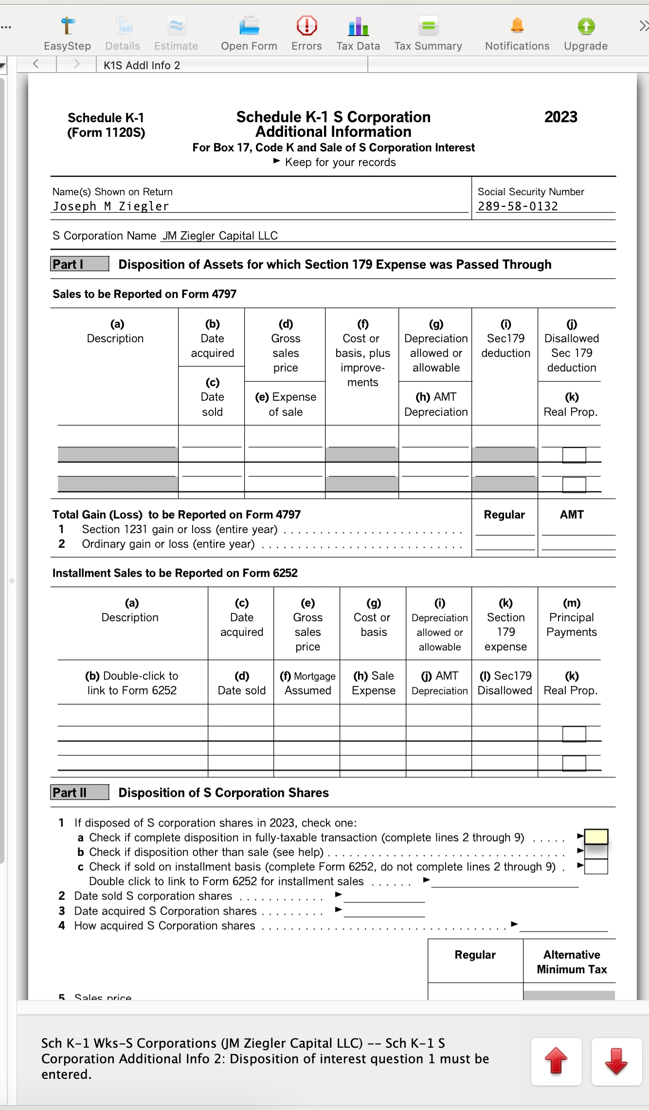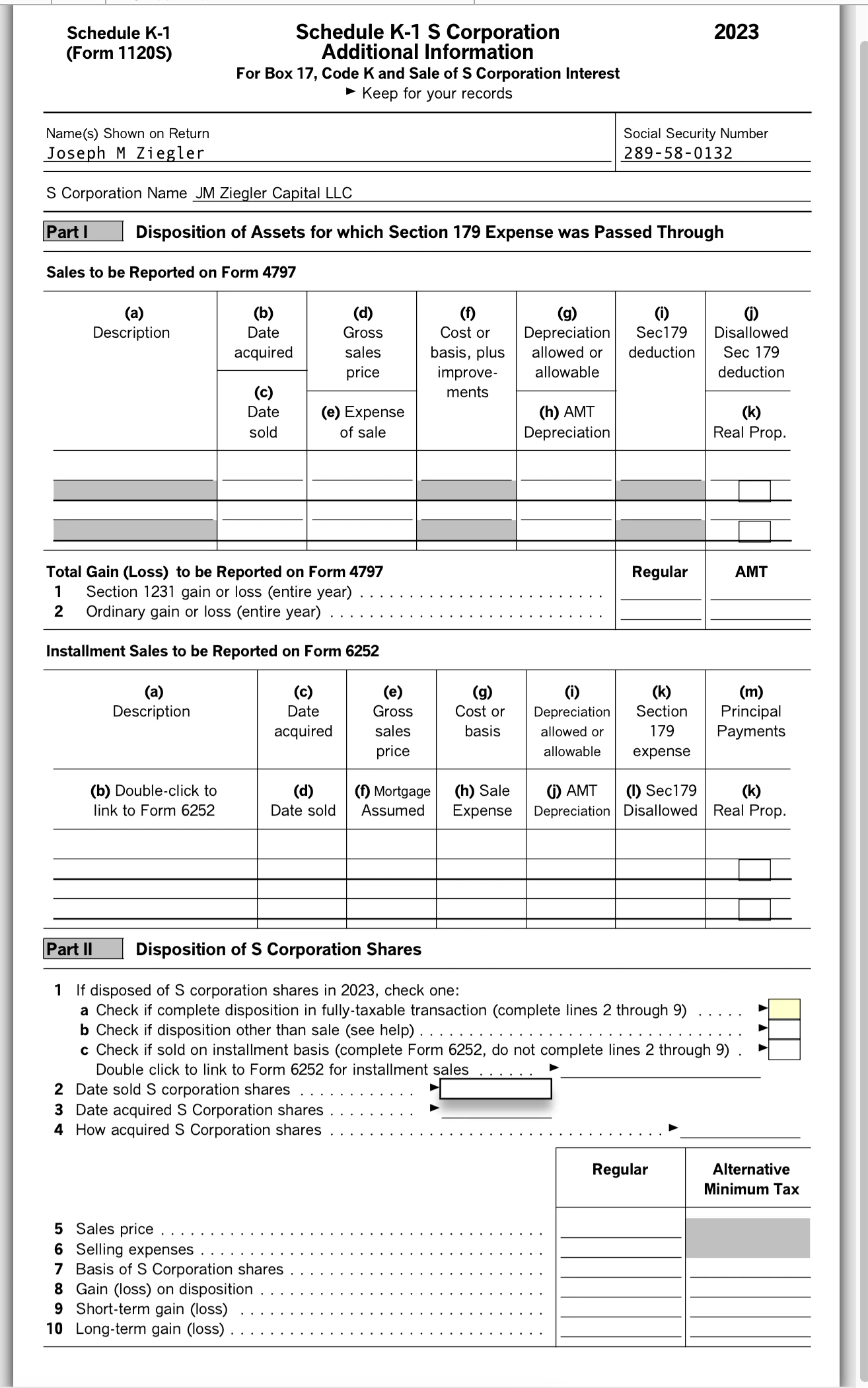 Schedule K-1 2023 Final K-1 Checkbox - Disposition of S-Corp interest information