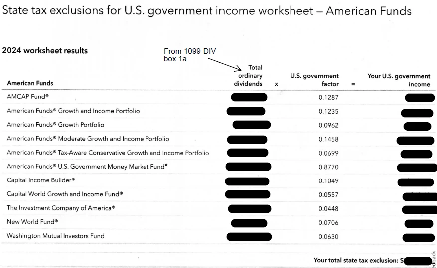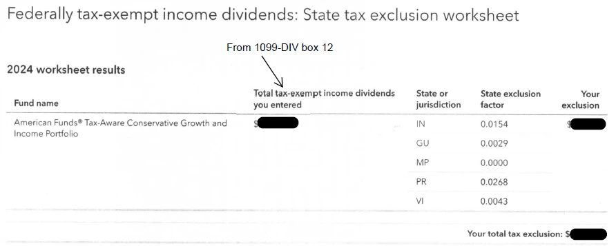 I have investments in American Funds, and some of the dividends are tax-exempt. They provide a 1099-DIV and provide two worksheets. Here are the titles: