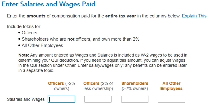 See photo of this page attached. I can't remember if you just enter box 1 of the W2? Or do you add box 12 code D (401k contributions) for total W2 wages? If you are both an officer >2% and shareholder >2%, does it matter which box you enter it in?