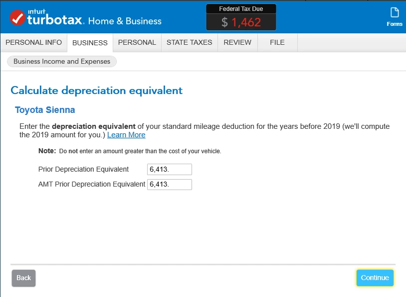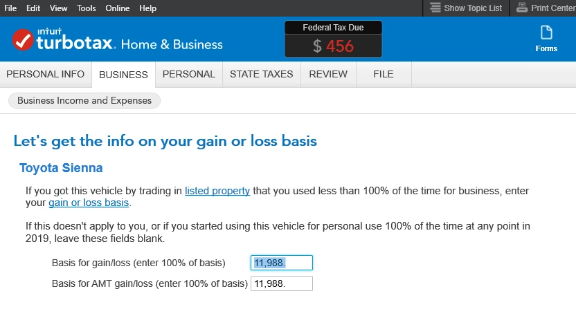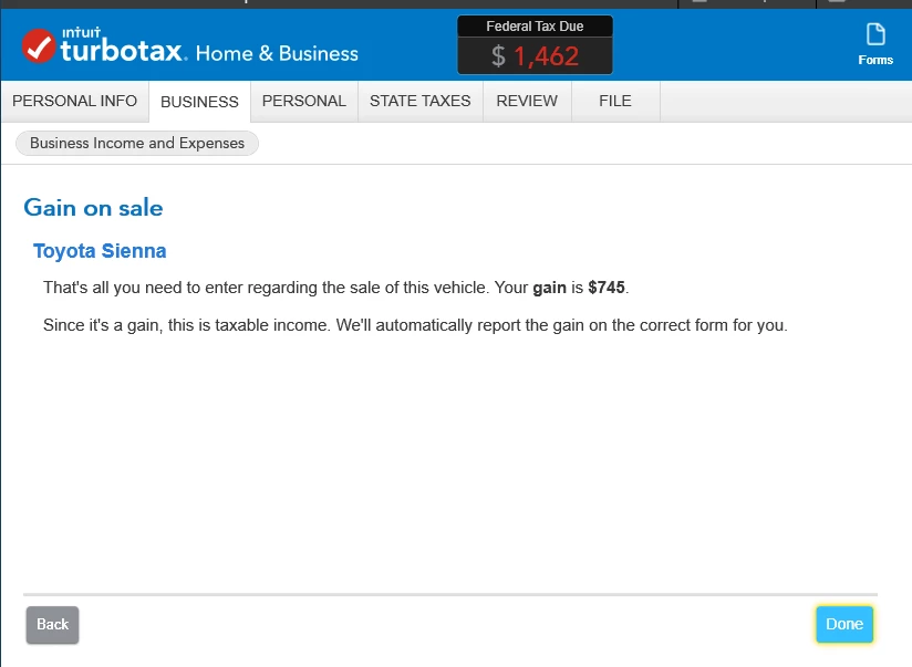I bought a used car for $8,000 in 2012 and used it for personal & self-employed business. I took mileage deductions but no depreciation - unless TurboTax automatically depreciates through mileage. I sold it for $1700 in 2019. How do I handle the sale now when TurboTax wants to know about basis for gain/loss and depreciation equivalent? If I leave everything blank it says the $1700 sale price is taxable income.
