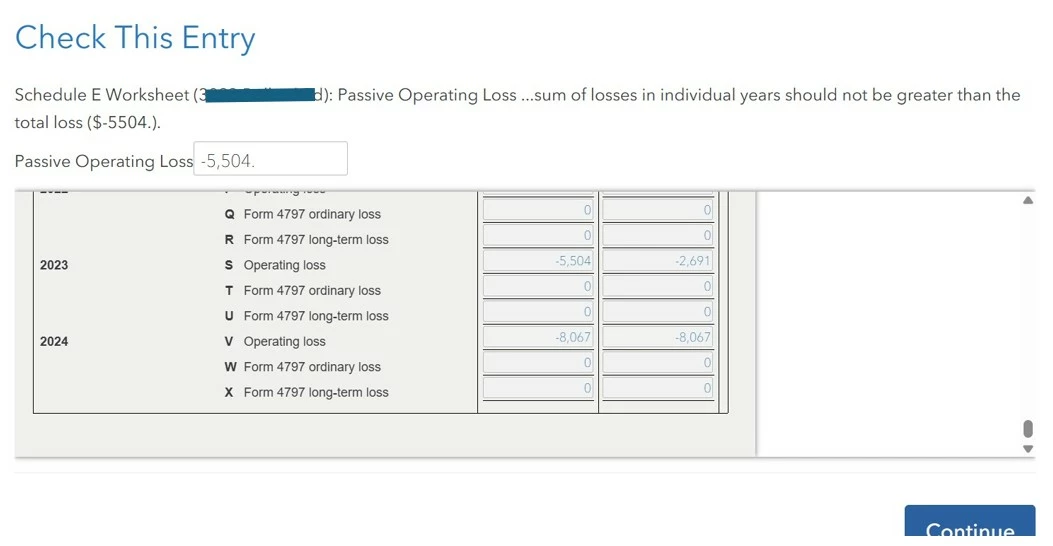 My rental house has a loss, rather than profit. After I filled up the return online, the Review section said that the Passive Operating Loss in Schedule E Worksheet is missing. What number should I put there? I have used TurboTax online for many years and also had rental loss several years, but have never been asked for that before. I tried to put in last year's carryover number (from last year's Form 8582, Part VII column c) or the number of current year's loss, but it did not help - The Review still asks me to check the same issue. Is this a bug in the program? Does someone know what I should do? Thanks!
