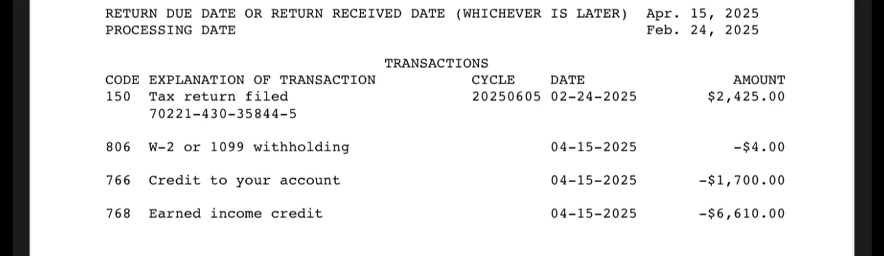 This means that your federal tax liability was $2,425, but you had credits and withholding totaling $8,314 ($4 + $1,700 + $6,610). Based on what you have shown, your credits and withholding exceed your tax liability, and you can expect a refund of $5,889 ($8,314 - $2,425).