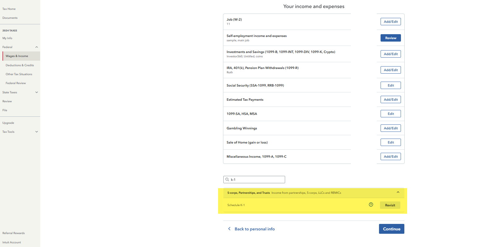 To find the entry for K-1, navigate to Federal > Wages & Income, then find the heading S-corps, Partnerships, and Trusts. Schedule K-1 is located here. You can also use the search box using the magnifying glass in upper right of your screen, type "K-1", then "Jump to K-1."