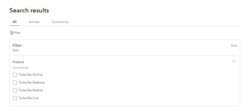 When you search a topic in the Community, you can filter the results by Articles, Community thread, and product.