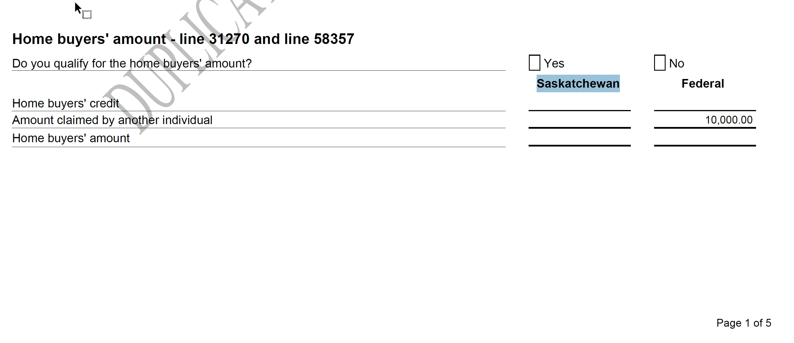 Line 31270 Home buyers amount (aka first-time Home buyers tax credit) is a credit for people who have bought their first home. Did you or your spouse apply for this credit?