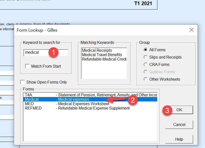 In the Form Lookup screen write medical then click on Medical expenses and OK as indicated on the image.