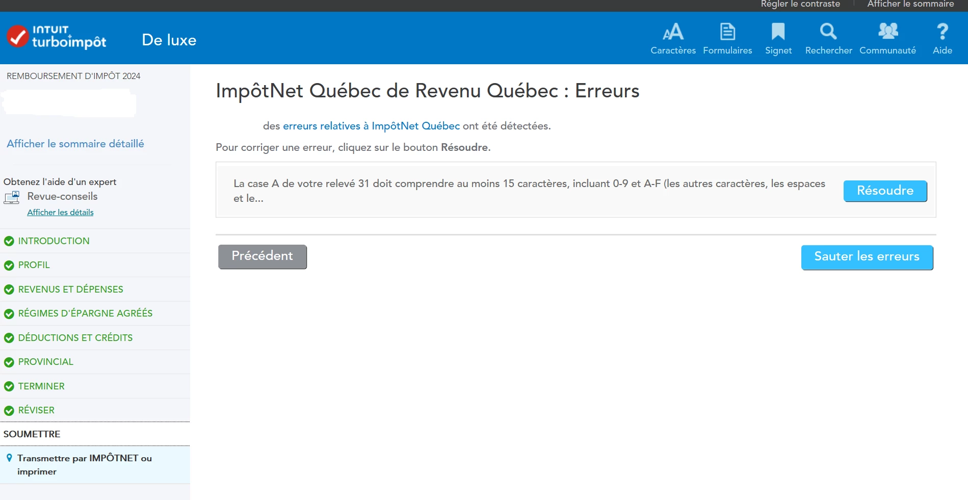 Erreur à l'étape "Transmettrepar IMPOTNET" liée au Relevé 31 de ma conjoint