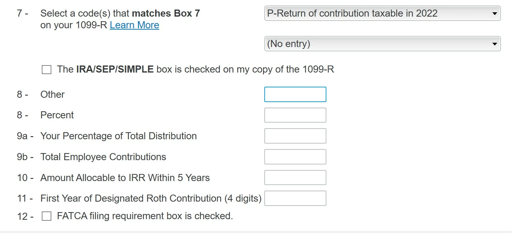 3. I contributed $6,500 to a Roth. It was not recharacterized, no prior conversions, no past excess contributions. Not a repayment of a retirement distribution. I am covered by a retirement plan at work.