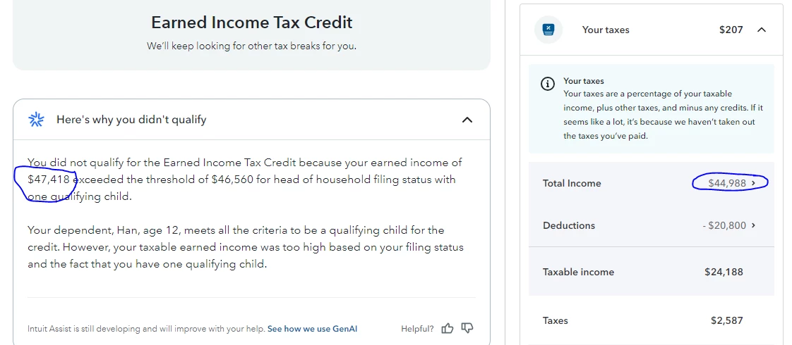 Can anyone tell me how Turbotax calculate my EIC. I think my AGI should be $44k (on the right side), not $47K which I dont know how it was calculated, it is not my wage.