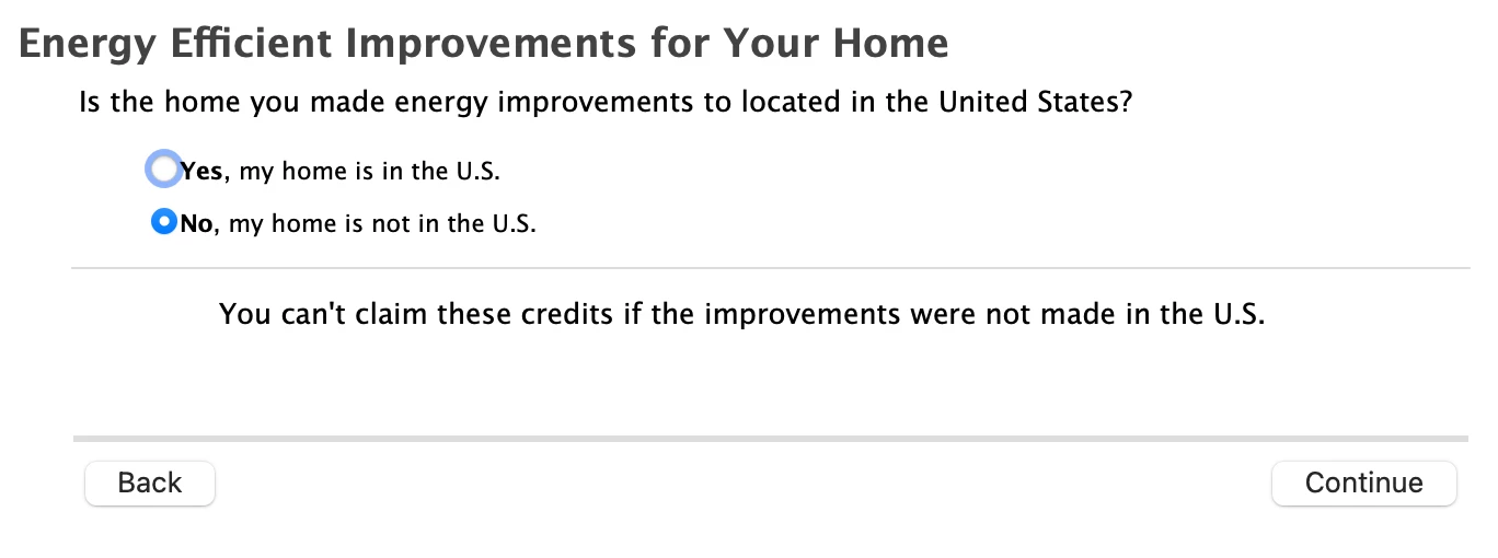 However, I struggle with the wording of completing the Turbotax EasyStep. The home is located in the US, but where I personally live is NOT in the US. Turbotax has my overseas address and when I select YES, it doesn’t point out that I’m not eligible for this credit. When I select NO, it says that the improvements were NOT made in the US, but that is INCORRECT. The house is in California.