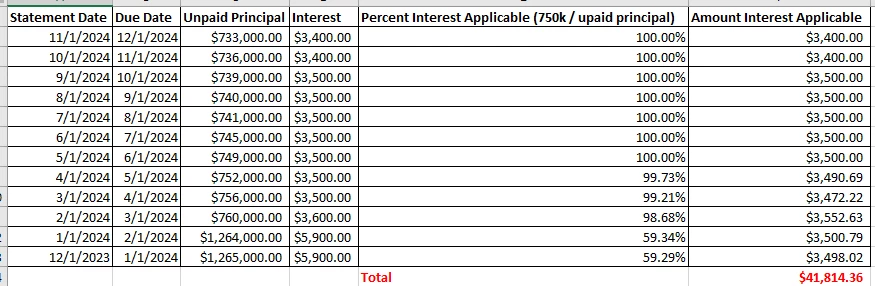 We had a loan with a principal balance of ~1,270,000. In January we applied a 500,000 payment, thus reducing amount down to 760000 after selling our prior home. My 1098 only has two numbers, the original amount of 1,270,000 along with the interest paid of 44,000. Turbo tax seems to scale the deduction based on 750000 / 1270000 which of course is incorrect since the loan was only that high for January. I went ahead and calculated the percent of interest that would be applicable for each month - (interest paid * (750000 / principal balance)) when principal was over 750k. I then summed the 'scaled' interest amount for the year and put that amount in turbo tax along with the principal amount of 750000 so it applied the calculated interest amount. I also added a comment into the form since i flagged my amount differed than what was provided to me. Is this logic valid or do i have to use the original loan amount on January 1st for every month?