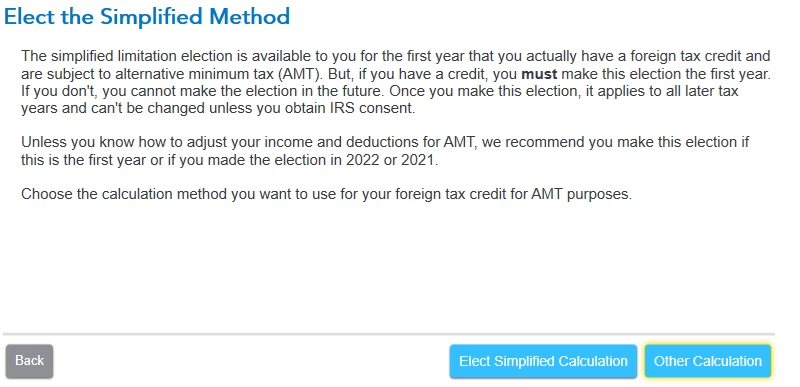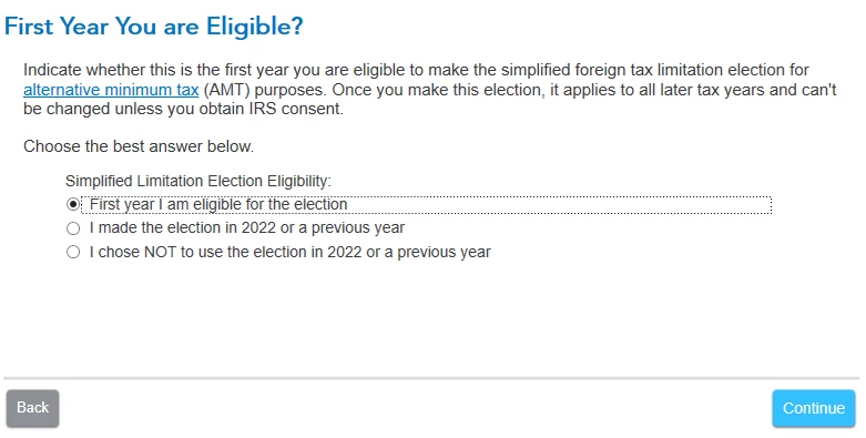 I am filing my 2023 federal tax return and while trying to work on my deductions & credits, specifically for Foreign Tax Credit, I am being asked about Simplified Limitation Election for AMT when I am trying to take tax credits. Meanwhile, this is the first year I am taking tax credits as previous years, though I had foreign earned income but the entire amount could be excluded resulting in not having the need to take the tax credits.