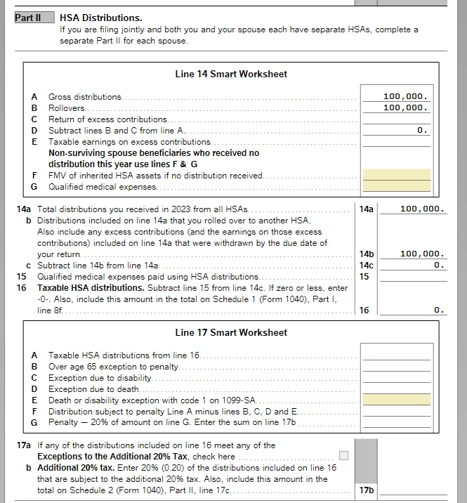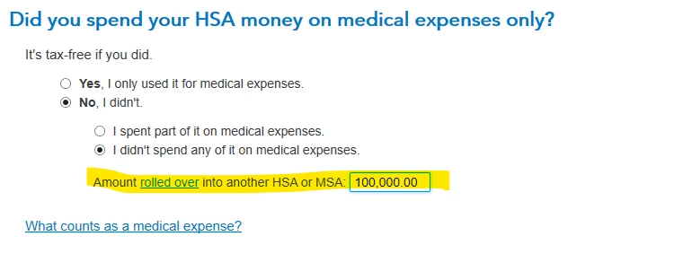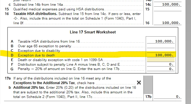 I received my late wife's HSA in 2023 as a check. I created and HSA at Fidelity and deposited the check into it. I've received a 1099-SA from my wife's HSA account. How to I handle this in TurboTax (Premiere). It seems to want to keep trying to tax me for that like it was distribution. It was distributed (but check never cashed by me) and directly deposited/rolled over to my own HSA. I can't find Form 8889 part II in TurboTax forms either which I believe handles some of that. On the walk me through it part of turbo tax click I had an HSA it treats it like a distribution, if I check none of the above it ignores entirely.