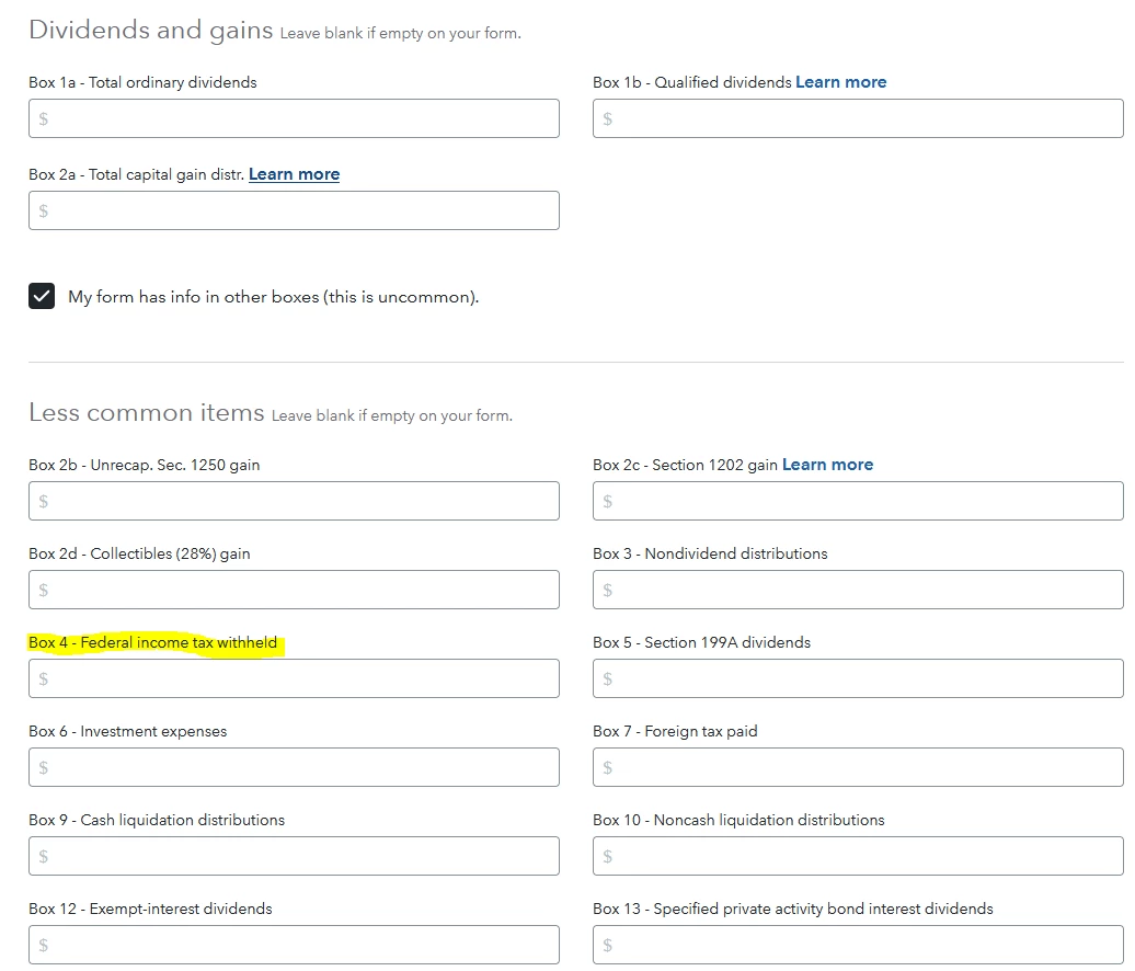 But I can't figure out where should I enter "Gross income" and "Federal tax withheld" amounts from 1042-S in Turbotax. There is only a field for "Income" but not for "Federal tax withheld".