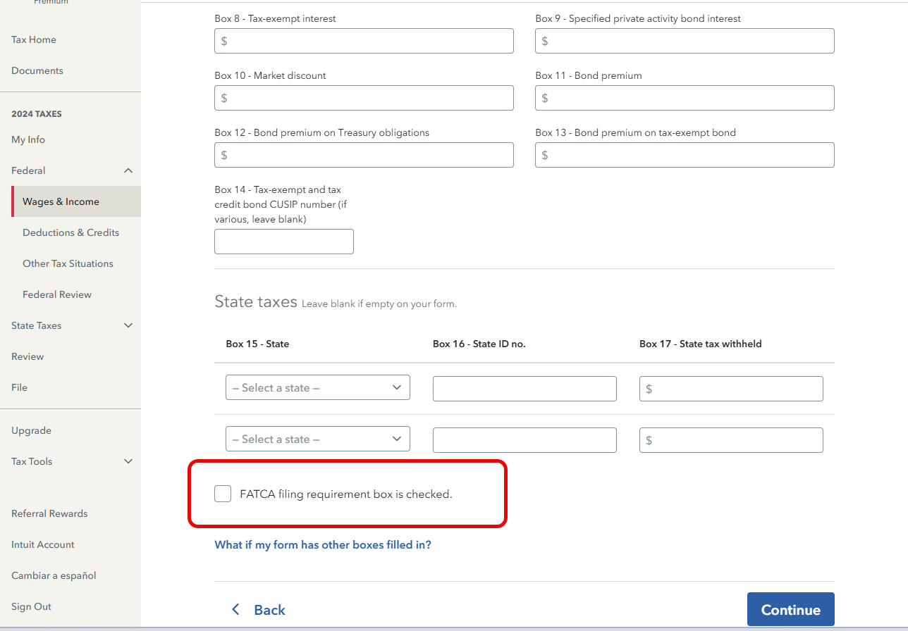 If that looks correct, there may be an error in one of your entries from your bank (1099-INT, 1099-DIV, etc). Revisit all your entries and be sure the box "FATCA filing requirement box is checked." is not checked, if it is not checked on your forms. You may have to select "My form has info in other boxes (this is uncommon)" first to expand.