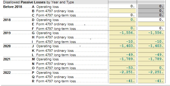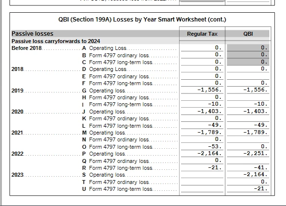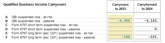 I have several K-1 PTP's and each seem to have this same issue. Box 1 is a passive loss and seems to create a tax loss carry-forward properly in the 2023 Tax Return. As I view the "Carry Forwards to 2023 Additional Info for Section 199A Deduction, I see the following for this PTP, which is the correct information carried forward into 2023 from the prior tax year: