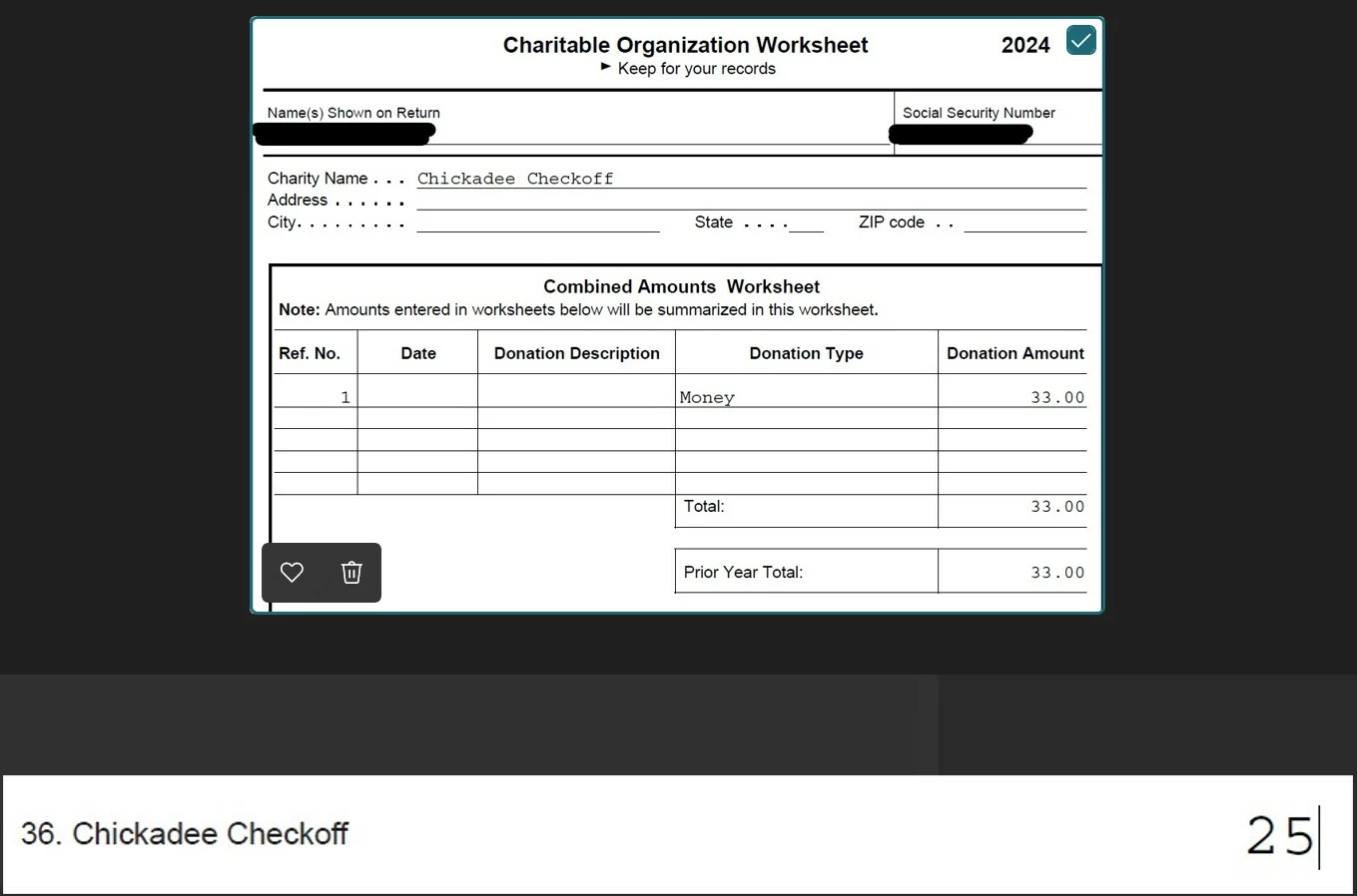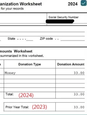 1) Last year, during 2024, when making up your KS tax filing, you made a $33 contribution to a state check-off charity. That donation was done during 2024....so it gets added to the 2024 Federal tax return (being prepared now) as a donation made during 2024.