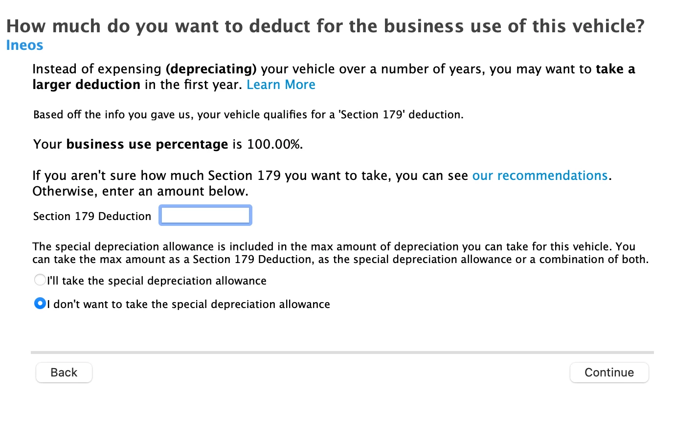 On the page "How much do you want to deduct for the business use of this vehicle?"