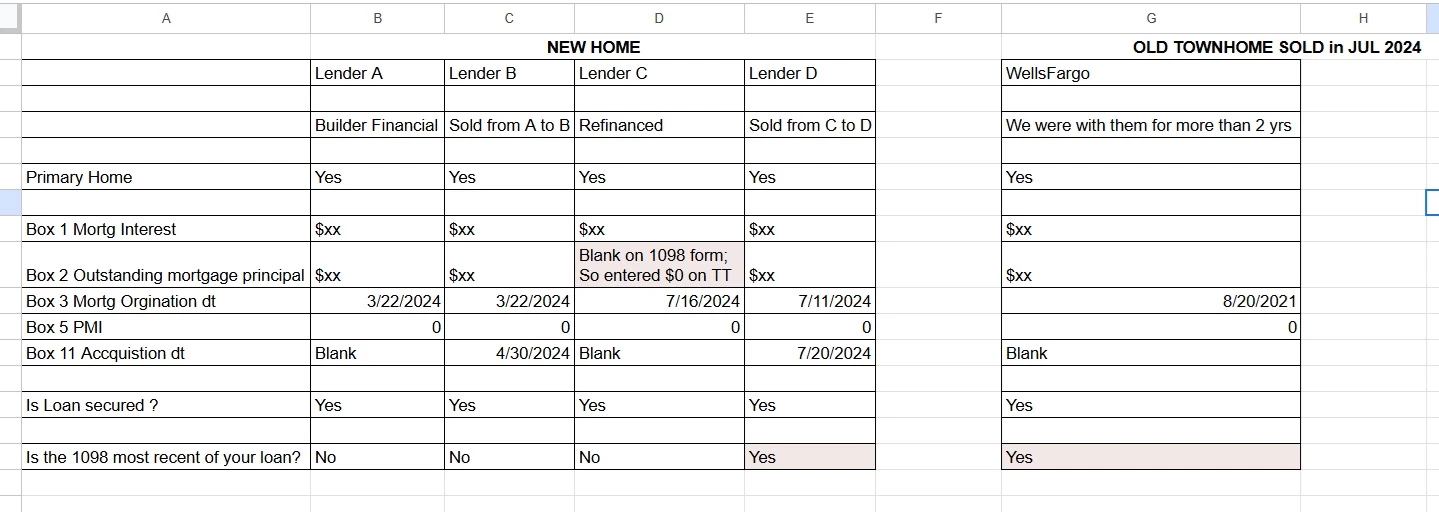On Turbotax Desktop under Deductions, I created 4 entries for above 4 lenders related to my new home and marked lender D as Most recent.
